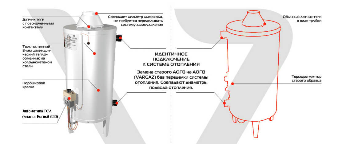 Одним из главных преимуществ газовых котлов Vargaz является идентичное подключение к системе отопления, что позволяет осуществить быструю замену старого АОГВ на АОГВ Vargaz без необходимости в дополнительных расходах на монтаж и переделку дымохода. Диаметры подвода отопления и дымохода в обоих моделях совпадают, что облегчает процесс замены и исключает необходимость в переделке системы дымоудаления.